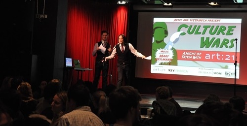 On January 28, Art21 and 92YTribeca piloted a program called Culture Wars: A Night of Trivia with Art21. The night began with a music play list created by artist Mary Heilmann (Season 5). By 6:30pm all 18 teams were registered, seated with beers in hand, and ready for the main event. In addition to the general public forming teams, there were also teams representing institutions like the Museum of Modern Art, the Guggenheim Museum, the Metropolitan Museum, Cambridge University Press, Bomb Magazine, and 20X200.