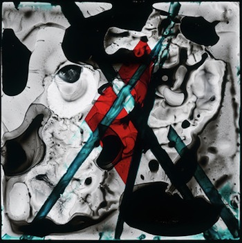Edgar Cleijne and Ellen Gallagher, "Better Dimension (detail)", 2010. Ink and tape on glass slide from an installation of silkscreened wood panels, four Hasselblad slide projectors, one 16 mm eiki projector, resin and steel projection screen, 106 × 252 × 268 in. Collection of the artist; courtesy Gagosian Gallery, New York.