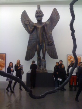 Robert Cuoghi, "Pazuzu," 2008. Epoxy, solvent varnish, fiberglass, polystyrene, and steel. Installation view, New Museum, New York, NY. (Foreground: Urs Fischer, "Cioran Handrail," 2006. Epoxy resin, pigment and enamel) Photo: Kevin McGarry.
