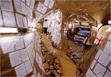 While Thomas Hirschhorn’s Cavemanman installation is made out of completely modern materials, such as cardboard and packing tape (like Noble and Webster’s work), it places the visitor inside the cave and the caveman inside us. This gets closer to the Encino Man sensibility of freely collapsing distinctions between us and them, allowing cross-identifications. However, while Encino Man sublimates this collapse into assimilation and joy, Cavemanman attempts to extract an anxiety around extinction, albeit through a comic form. The tension resolves itself in parody and the violent immanence of the caveman is kept at bay.