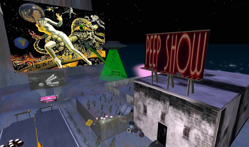 The Caerleon sims are part of the Virtual Art Initiative, founded in Second Life by Dr. Gary Zabel (Georg Janick in SL) in 2008. The project has grown to include several sims (short for simulations) in Second Life and on Reaction Grid, another virtual 3D world. The Caerleon sims are home to over 30 resident artists and feature a wide range of exhibitions, collaborative projects, classes, and experimental virtual art spaces. I became aware of the Caerleon sims a little over a year ago, when I was invited to check out The Lost Wages of Sin, an “environmental assemblage installation” in Second Life by Pixel Sideways. The installation included a Betty Page peep show, among several wonderfully kitschy 1950s-themed posters, galleries, 3D objects and video displays.