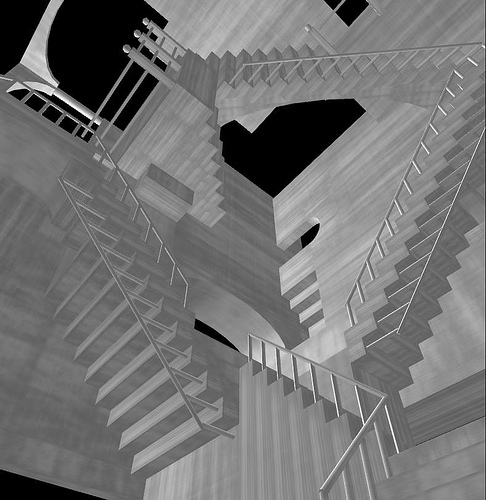 I’ve always loved Escher’s creations for the strong emotions I felt in admiring his works. Creating 3D Relativity in SL has been a way to thank him for the enthusiasm he injected into me. I’d like to dedicate my work to him, to his modernity and his ability of showing objects in a visionary way. He was surely aware that one day, technology would be able to complete the work he created decades before. I created Relativity by using the simple elements of “build,” shaping every piece one by one without using any script. It can be defined as a handmade work.
