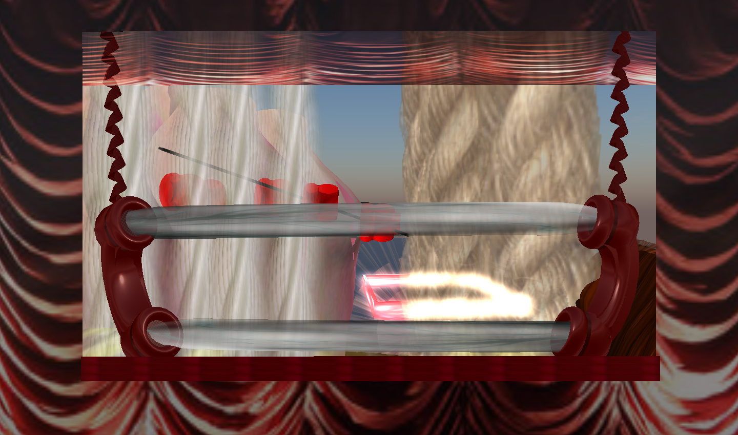 When the user wears the HUD (Heads Up Display), their avatar screen view is transformed into a surreal stage. The viewer then has the creative user interface at their hands to click on parts of the HUD (the stage and objects) to create what becomes a combined experience of an art installation and performance. The work is user driven. The cause/effect element in the work leads the viewer in a curious experience.
