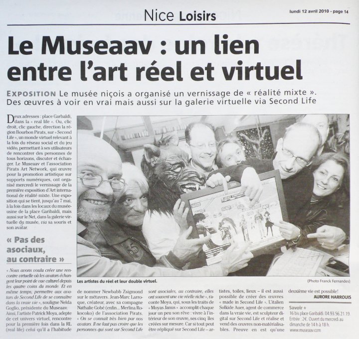 I was holding a spot to interview Jean-Marc Larroque AKA Newbab Zsigmond and Nathalie Gobé AKA Merlina Rokocoko, founders of Pirats Art Network but the US/French time difference proved problematic. I met Newbab at the Museaav opening, as part of Through the Virtual Looking Glass on April 4. Since then I’ve visited two other Pirats’ exhibitions and witnessed how active the group has been in Second Life. If possible, I will include other information from them in the comments section. The Netherlands also joined in with their own real life/SL exhibition on Sunday, April 18. This show includes work from Aristide Desprez AKA Philippe Moreaux who I interviewed for Art & the Avatar: Ambiguity of Identity in Virtual 3D Worlds.