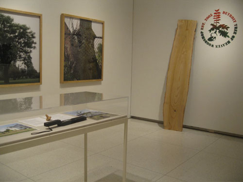 Of the artists participating in Heartland, Smith notes that “some brought in clear finished ideas about what they want to do, so there wasn’t a lot of back and forth discussion. With the Detroit Tree of Heaven Woodshop [a group consisting of Mitch Cope, Ingo Vetter, and Annette Weisser that investigates the ways in which a plant normally considered a weed can be used as a sustainable crop], we went back and forth about different things we might try. The group decided to use the modest materials fee that we’d set aside for them to purchase a vacant lot in Detroit and make a Tree of Heaven plantation there.” The exhibition space also included photographs and objects made from Detroit Tree of Heaven wood.