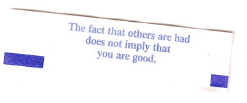 At a Chinese restaurant, I once received the following fortune in my cookie: “The fact that others are bad does not imply that you are good.”  One of my primary goals for the class is that students, who begin with the opinion that ethics is something that applies to other people and that ethics statements really have nothing to do with them and their careers, discover a compass within themselves.