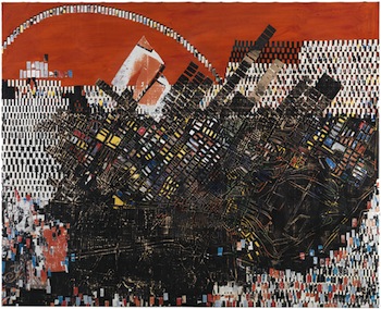 Mark Bradford, "Scorched Earth", 2006. Billboard paper, photomechanical reproductions, acrylic gel medium, carbon paper, acrylic paint, bleach, and additional mixed media on canvas, 94 1/2 x 118 in. Collection of Dennis and Debra Scholl Photo: Bruce M. White. Courtesy Wexner Center for the Arts.