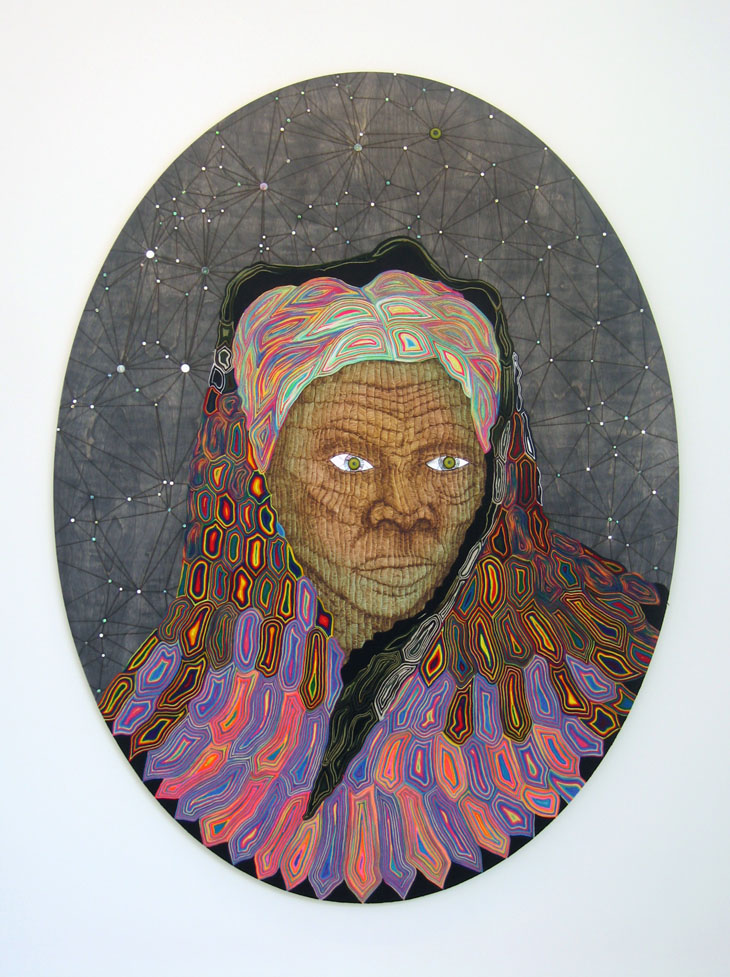 Matthew Day Jackson, "Harriet (Last Portrait)," 2006. Woodburned drawing, yarn, aniline dye, mother of pearl, abalone and black panther eyes on wood panel, 243.8 x 182.9 cm.