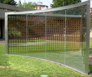 These questions came to mind on a recent trip to the Hirshhorn Museum in DC (I’ll review the ColorForms exhibition in an upcoming post), where I saw Dan Graham’s For Gordon Bunshaft (2008) commissioned for the sculpture garden opposite the museum. One of the artist’s signature “pavilions,” it honors Hirshhorn architect Gordon Bunshaft (1909-1990), whose other notable achievements include Yale’s Bienecke Rare Book and Manuscript Library (1963).