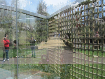 Graham’s sculpture references Bunshaft’s brutalist structure specifically, as well as modernism and architecture in general, in several ways. The wooden lattice wall corresponds to the Hirshhorn’s interior courtyard windows (above); to the modernist grid employed by Sol Lewitt and other Minimalists; and to Japanese architecture. The two-way mirror glass and steel frame comprising the other sides of the triangle are materials of corporate architecture which, Graham has noted, are often used “to control a person or group’s social reality” in public spaces like airports or hospitals. (The sliding glass door does have the heft and feel of walking into a lobby.) Other references are more subtle — through a podcast talk with Hirshhorn curatorial assistant Al Miner, I learned that the common slate floor inside alludes to the backyard patios that were ubiquitous in suburban New Jersey, where Graham was raised. I didn’t notice this material on my visit, but it closes the loop on the play of opposites common to much of Graham’s work – urban/suburban, corporate/domestic, interior/exterior.