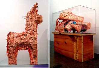 The ceremonial destruction of an artist’s piñata typically corresponds with an exhibition’s closing. Aaron Krach’s copperleaf donkey, Indestructible Object (2009), was instead smashed at the grand opening of Invisible Exports gallery last year. The crushed shell was displayed in plexi for the remainder of the show. Krach is largely interested in objects you can’t keep. Or if you keep it, “you have to recognize that it changes.” He explains: “A scratched lottery ticket that doesn’t offer a prize. Is it useless? It’s still the same piece of paper on an elemental level. Same with a piñata. It’s still sculptural and interesting, but it’s been ‘destroyed’ in most viewers’ eyes. I want to subvert that.”