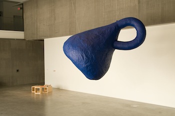 Since January, museum audiences in the United States and Europe have been taking whacks at Klein bottle piñata (2009) created by Mariana Castillo Deball for the traveling exhibition For the blind man in the dark room looking for the black cat that isn’t there, organized by the Contemporary Art Museum St. Louis. Hung in austere museum lobbies, Deball’s Piñata looks more like an semi-precious kinetic sculpture than a goodie-filled party piece. Its color and title intimate the intense blue hue developed by French artist Yves Klein, while the shape refers to the “bottle” attributed to nineteenth-century German mathematician Felix Klein. In short, the Klein bottle is a topological surface with no inside or outside. “It’s a container that has no content, or has no possibility of having content,” says the artist. Klein bottle piñata was born out of a lecture-style performance about black boxing and how greater sophistication of knowledge makes technology more cryptic for its users. “For example,” said Deball in a recent video podcast, “everyone has refrigerators, computers, and mobile phones, but nobody knows how actually these devices work. This piñata is a sort of metaphor for [how] cryptic all the objects and the things we use on a daily basis have become.”