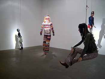 For some artists, stuffing their piñata is not as important as the beating it will take, especially when it’s a self-portrait. From 2002-2007, Los Angeles-based artist Meg Cranston created a series of empty piñatas in her own image. Each piece in the series is titled after the anthropological documentary Magical Death (1973) about the Yanomami people of Brazil who use ritual warfare, or “shamanic drama” to avoid real blood shed. According to Artforum, early in the series Cranston invited visitors to “enact a similar ritual murder on her own pendant form—if they would be willing to pay for the pleasure by buying the work.” Cranston later suggested that no one had taken her up on this masochistic challenge and for this reason she filled her last piñata with candy. “The violence has to occur,” she said, “so the figure (my doppelgänger) can symbolically triumph.” When Jamaica-born artist Dave McKenzie commissioned an effigy of himself as piñata, his “hanging” and “beating” had entirely different connotations. The video Self-Portrait Piñata (2002) documents an event at the Queens Museum of Art in which museum-goers joyously bash McKenzie’s likeness. Candy and fun seem trivial, if not inappropriate, as his dangling lifeless figure begins to conjure America’s history of lynching and other racially charged violence.