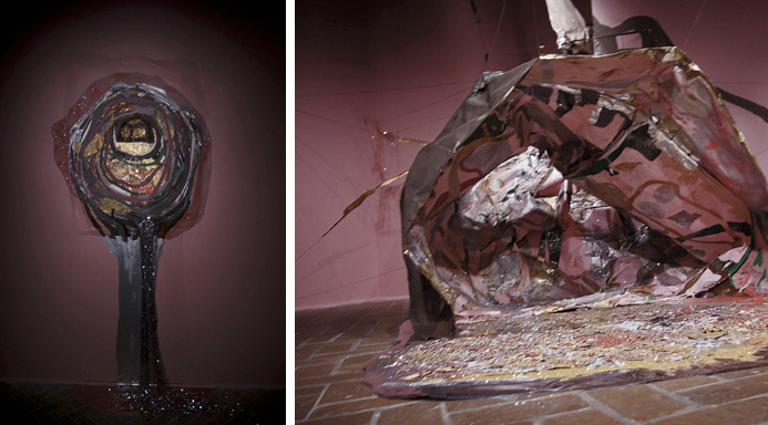 GK: While looking at your work, I felt the urge to put on Sun Ra. Your work at first seems raw, coarse, at times violently loud and feminine, or reserved and phallic. Cocooned elements in womb-like luscious structures combined with what it may seem a tacky childlike finish and a dominant palette create that very same cacophony I enjoy in Sun Ra’s music. What I mean by that is that your work is not traditionally easy on the eyes but is strong and intense. And on top of that, your work gives away your gender and hints at your ethnic background. Please discuss Cornered, Monument to My Ruins, and Afro Dunce for me.