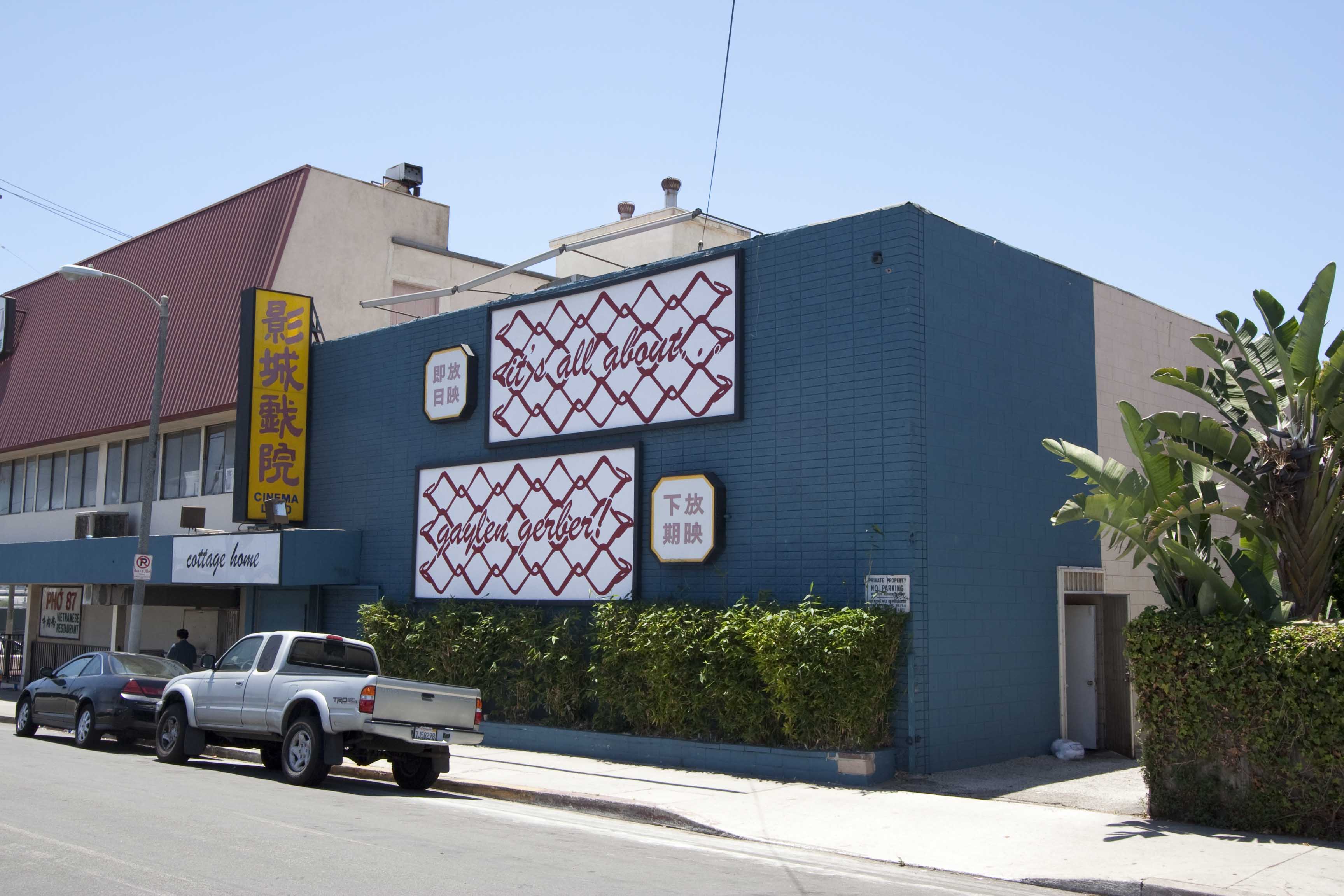 A former theater, Cottage Home has a boxy blue exterior that Kathryn Andrews takes advantage of, posting two printed billboards that make the gallery’s outside wall look especially festive. These billboards announce that “it’s all about Gaylen Gerber” in red lower-case script that dances across a chain-linked pattern. The shout-out either gets the exhibition off to a supportive start, or suggests a hierarchy. If it’s all about Gaylen Gerber, then are Andrews and Tannatt here to support him? Or is he supporting them?