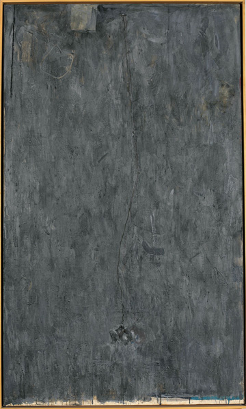 Last weekend in the East Wing of the National Gallery of Art, I had an encounter with a Jasper Johns painting that provides not so much an example (that would take too long to describe) but an allegory of what I’m talking about. From across one of the modern/contemporary galleries, I saw a largish slate-gray canvas with an irregular, painterly surface. As I approached the piece, I noticed what looks like a crudely straightened length of clothes hanger wire, hanging from an eye screw in the top center of the canvas. Dangling from the bottom of the wire, camouflaged the same color as the canvas, was the word “NO.”