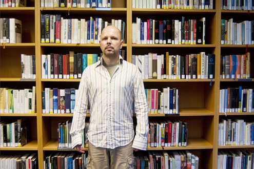 In the first video, a middle-aged man named Uwe B. sings songs and recites poems he learned as a schoolboy. Though he is German, these are delivered in Russian, the language of this man’s East German youth. In the second frame, the camera slowly pans the library of the former Manhattan home of the West Germany’s ambassador. It was in this room that leaders from West Germany and the Soviet Union purportedly planned the demise of the GDR back in 1989. In the installation’s final segment, Peter S. attempts to disassemble and reassemble an AK-47 rifle while blindfolded, a skill he learned as part of his compulsive military service for the GDR. Smolarz chose to represent these two men because to her, they represent typical former citizens of the GDR. In an email message Smolarz noted that, “symbolically I found the language and the military service reflected the influence Russia had on the Eastern Block best.”