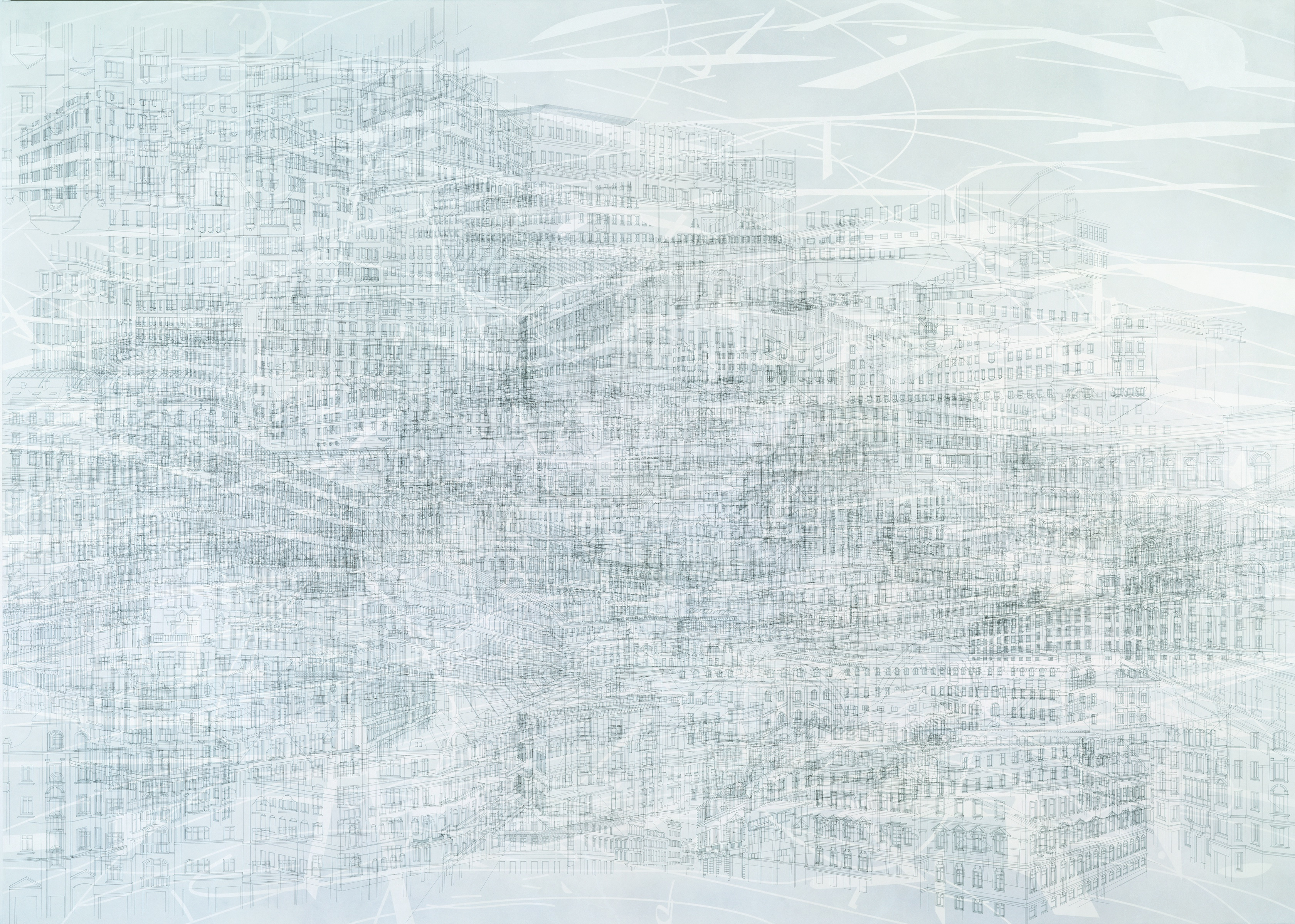 The Guggenheim Museum in New York is currently exhibiting Julie Mehretu: Grey Area, composed of six semi-abstract paintings Mehretu was commissioned to make in 2007 by Deutsche Bank and the Solomon R. Guggenheim Foundation. Thanks to this commission, Mehretu was able to rent studio space in Berlin and hang her canvases together, working on them at the same time. As a result, they dialog with each other and within the theme of the show’s title, Grey Area. Though cities may be the large topic of the paintings, Berlin takes center stage. In Berliner Platz, she seemingly forgets the modern-day city and depicts the city’s buildings as they may have looked 100 years ago, effacing Berlin’s less than attractive modern history.