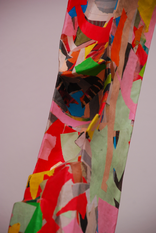 The new work comes out of my collages, where I dissect and rearrange an original towards an alternate composition. The new work, however, has no original reference and becomes stream of consciousness construction, an additive process. I have this idea of the God Particle in my mind since reading about it. It’s amazing — these scientists at the CERN laboratory are smashing particles together at nearly the speed of light in hopes of explaining the origins of the universe. My approach is sort of like that, but instead of sub-atomic particles, I use cardboard and paper. Its very elemental; I try to let the work build itself from the inside out towards a critical mass. Randomness is very much a part of the process, which I try to carry through so that color and form literally reference the work’s creation. Calling the sculptures 3D paintings, well, I’m not sure I’m there yet in calling them paintings.