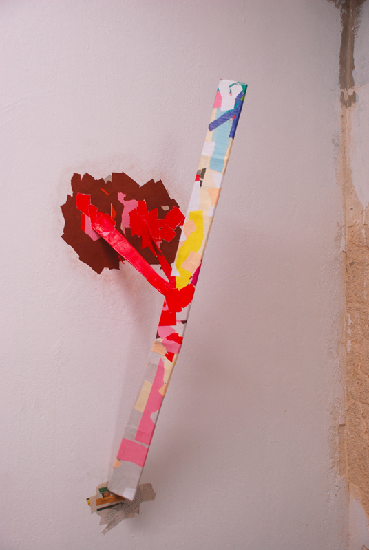 Georgia Kotretsos: At your studio you have old work next to NEW work, NEW territories, NEW experiments without once mentioning Jacques Rancière, Gilles Deleuze, or Guy Debord. The past six months, you ventured into 3D paintings that seem to be gripping onto the wall for dear life by creating the fine tension of an object’s struggle to fight for a spot on the wall. They are organically placed and conceptually witty. Papier-mâché structures that almost seem painterly from afar are collaged with colored paper. Take me through your journey; break down the evolution of these new works for the Art21 readers, please.