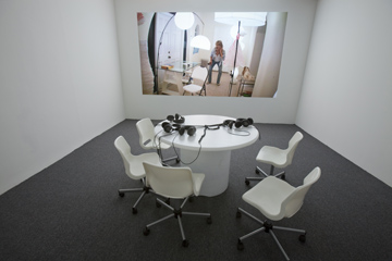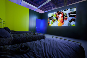 Mechanisms set in place to control the viewer’s experience of these digital video projections reinforce this passivity. Audio accessible only by wired headphones keeps the viewer tethered to a seating arrangement that, more often than not, responds directly to the content of a given video, drawing the viewer ever deeper into Trecartin’s maddening world. From a picnic table to abbreviated bleachers reminiscent of high school, the viewer occupies physical spaces in keeping with the adolescent lives perversely at play on the screen. In cases where the viewer is made to lie in a bed or recline in an airplane seat, identification with the video’s neurotic subjects borders on the self-annihilation that already afflicts Trecartin’s media-obsessed characters. Much like Campus’s Anamnesis, the viewer’s presence is complicit in the making of this work, but Trecartin’s control of the scene drains action from the body, makes the viewer receptive and alarmingly malleable.
