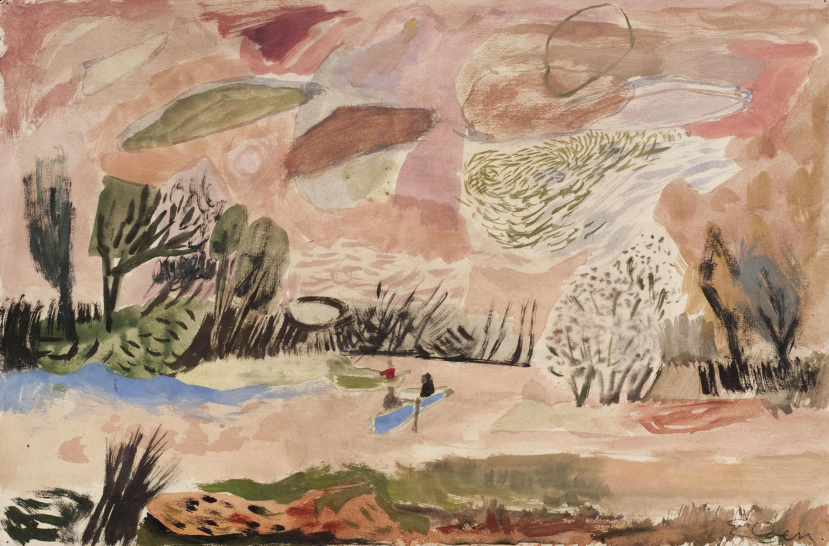 Issues of civic branding aside, Ox-Bow’s importance to the Midwestern art community over the past century has been immense. The Ox-Bow school, says John Corbett, co-owner of Corbett vs. Dempsey, “has served as a sort of seed bed, a Utopian sanctuary for Chicago artists, replenishing them, re-connecting them with the natural environment, allowing them to experiment quite widely with unfamiliar media. If you consider the range of alums, Ox-Bow has been an important place not just to Chicago but to the American art scene in general.” Corbett and gallery co-founder Jim Dempsey were approached by the Ox-Bow Centennial committee several years ago with the idea of the gallery curating a show focused on the history of Ox-Bow. Corbett vs. Dempsey specializes in the work of Chicago artists and the post-1940 history of art in this region, making this gallery an ideal space to showcase work by Ox-Bow founder Fursman along with artists Albert Krebiel, Edgar Rupprecht, and Isobel Steele MacKinnon–all early supporters of Ox-Bow. The show also includes works by Francis Chapin, Eleanor Coen, Max Kahn, Ellen Lanyon, Miyoko Ito, Seymour Rosofsky, Margo Hoff, Peter Brötzman, Christina Ramberg, and others. There is also a small, very early lithograph by Claes Oldenburg on view behind the reception desk, made by the artist in the early 1950s when he was a student at Ox-Bow.