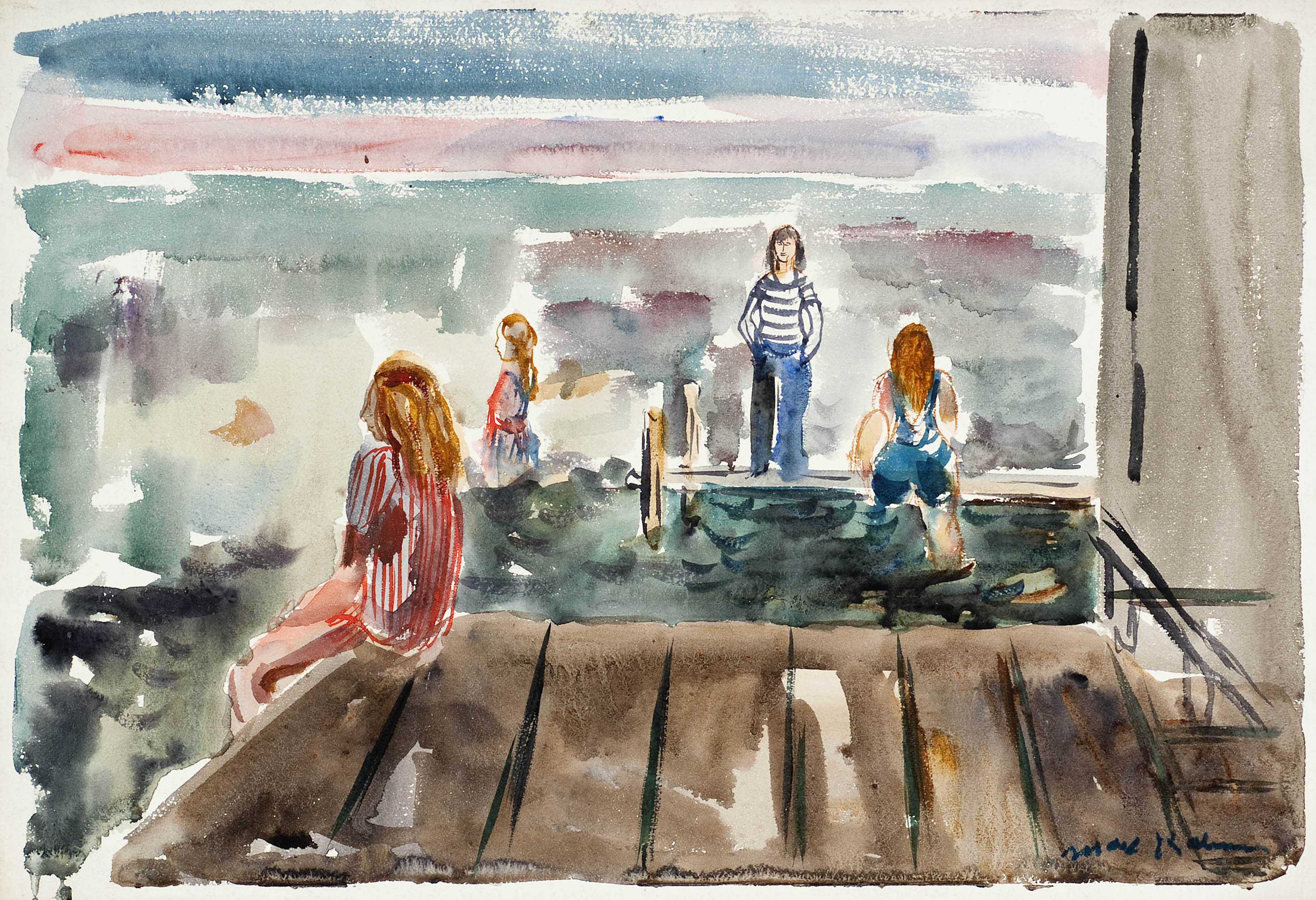 Several of the works on view at Corbett vs. Dempsey depict the small, simply appointed rooms that artists call home during their summer stays at Ox-Bow. Miyoko Ito’s lithograph My Room at Ox-Bow shows a room with a twin bed, a small desk and lamp, and a window flung open to the view outside. Margo Hoff’s Untitled (Ox-Bow Interior), c. 1945, shows a similarly spare little chamber that includes an unmade iron bed, a simple wicker chair and cushion, and a bottle of wine on an otherwise empty shelf. Here, too, an open window expands the pictorial view to the grounds outside. Both artists depict their rooms as spaces of solitary refuge that nevertheless remain open to community and the outside world. Max Kahn’s watercolor painting of several figures standing on a dock conveys a related idea: the figures in his painting are standing in proximity to one another, but they’re staring off in different directions, lost in their own private thoughts. The work of these artists suggest that at Ox-Bow, the artists’ retreat can be a space of private musing or of group conviviality. Whether it’s the former or the latter can change from moment to moment, depending on the individual’s frame of mind.