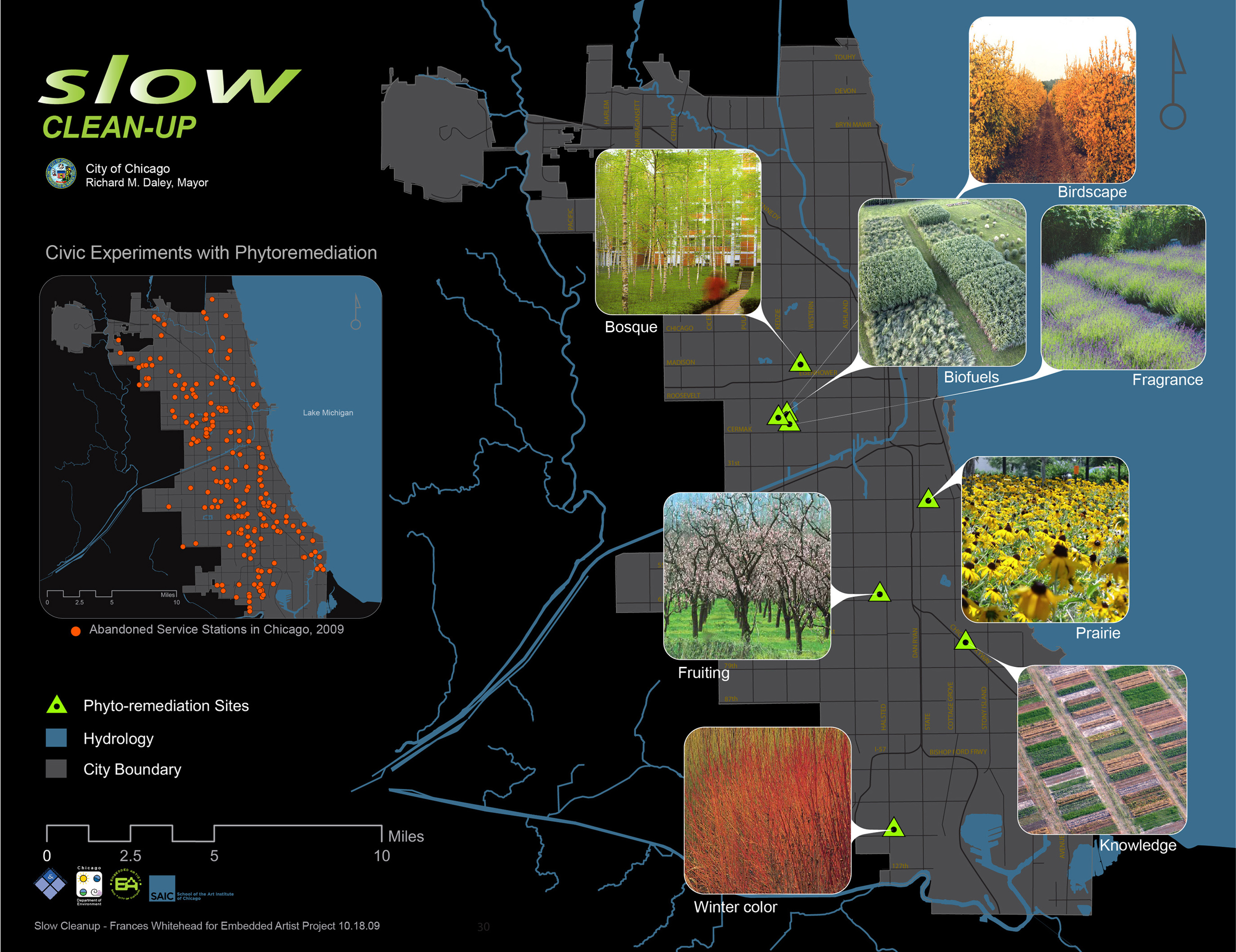 Whitehead’s involvement in public works projects convinced her that she had something valuable to contribute to the growing discourse on urban sustainability and design. She wants to continue to work in the public sphere, but she isn’t interested in adding more “Plop art” to the universe. Several years ago Whitehead founded the Embedded Artist Project, which she now conducts in partnership with The School of the Art Institute and the City of Chicago. The goal of the program is to “embed” practicing artists into city government in order to “bring new perspectives, mindsets, and processes” to planning projects that revolve around the city’s future. Whitehead now works part time in the city’s Innovation Program, where she works in the Department of the Environment on the Brownfield Initiative alongside a team of planners, scientists, botanists, and other experts on a project called Slow Cleanup that involves using phytoremediation techniques to reclaim abandoned gas stations throughout the city.