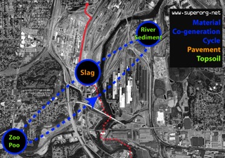 In 2005, with designer Lisa Norton, Whitehead developed SuperOrg in Cleveland, a project that involved coming up with concepts for the reclamation and revitalization of the Steelyard Commons area in the Cuyahoga River Valley. Their team had been asked to generate a master plan for a portion of a trail and greenway. Whitehead fixated on an enormous slag pile at the site, an area of visual blight about which many experts had concluded nothing could be done. Whitehead looked into the chemical makeup of the slag, and found that it could be “granulated” and used to make slag cement, which could then be sold locally.