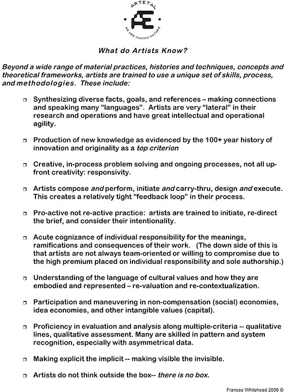 Whitehead is an enthusiastic proponent of the idea that an artist’s cognitive tool box is unique — and uniquely valuable — not just to “the art world” but to the world at large. To this end, she’s spent the better part of a decade researching, quantifying and articulating on both personal and professional, theoretical and pragmatic levels, the question of how artists can successfully engage practitioners in other fields in order to “get a seat at the table,” as she puts it. She’s come up with a document that she calls “What do Artists Know?” that she thinks of as “a knowledge claim.” It consists of a bullet-point list of specific “skills, processes and methodologies” that many contemporary artists possess, all of which were culled from observations made by Whitehead’s colleagues in design, planning, engineering, and other non-fine art fields over the years.