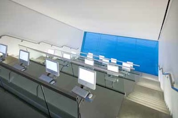Diller Scofidio + Renfro Architects, Poss Family Mediatheque, ICA Boston, 2006. Image via museum website. Photo by Iwan Baan. The large angled windows give the sense that one is floating above the water.