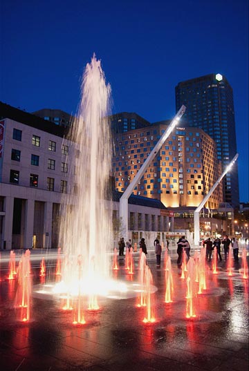 The fountain in Montreal's Place des Festivals in the Quartier des Spectacles is the largest programmable fountain in Canada (and currently features a nightly multimedia show by Moment Factory). This area functions as a fountain when it is not host to one of Montreal's multiple summer festivals. The city is currently revitalizing and creating the Quartier des Spectacles, an area of town with a high concentration of artistic venues around Place des Arts. Photo courtesy of Nancy Falso.