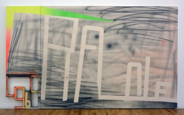 Painting takes a more concrete and robustly physical turn with Wendy White’s swashbuckling abstract paintings at Andrew Rafacz Gallery. White’s approach strikes me as a post-painterly take on a classically Situationist enterprise: the urban dérive. She synthesizes a range of visual stimuli, such as neon lights glimpsed through grimy warehouse windows, billboard and poster typography, polyglot street fashion and post-punk graphic design, in a manner that’s idiosyncratic and intuitive. During White’s conversation with Tom Sanford and Amanda Browder of Bad at Sports, she explained that her use of air brush and spray paint started when “the brush actually touching the canvas stopped making sense for me. Ironically I feel the paintings have become more direct now that I’ve physically backed off from them.” White’s canvases also directly engage their settings: some are placed on the floor; others have cut-out portions in the shape of numbers or windows that give view to the surface of the wall behind them. White relies on gut instincts rather than conceptual directives to make her paintings; partly for this reason, she tends to complete each canvas in a single go. “They’re very much a record of a moment, a time period…three or four hours for the big ones,” she said. This is the first time the New York-based White has exhibited at Rafacz’s gallery in Chicago. (You can find additional installation shots from the show on White’s website).