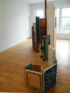 Like Wendy White, Chicago artist Dan Gunn makes objects that challenge normative ways of looking at a flat surface. Gunn’s extravagant, enveloping installations aren’t paintings, although I find it perversely pleasurable to think of them in precisely those terms. Titled Multistable Picture Fable, Gunn’s small solo show at Lloyd Dobler Gallery consisted of a sculptural environment composed of individual flat panels of various materials and sizes that are hinged together like doors, fences, or, to my mind, run-on sentences.