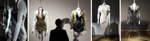 Saucier was responsible for most of the layout of the exhibition which takes place in the museum’s “Carré d’art contemporain,” a high-ceilinged large white room reserved for contemporary shows. Over a dozen outfits (mostly dresses) hang in three straight lines from headless mannequins while a video of Denis Gagnon’s recent runway shows is projected dramatically onto a three-dimensional pyramidal screen that protrudes from the ceiling. Oddly enough, for what the Museum is calling a “retrospective” (including in its press release on the exhibition), the clothes themselves are quite recent, namely from the designer’s Fall/Winter 2010, and Spring/Summer 2011 collections. The clothes themselves involve many handmade and couture detailing — suitable for special occasions but none of them appear to be too costumey to be deemed unwearable.