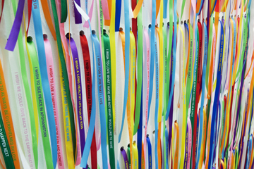 Detail from "I Wish Your Wish," 2003. Installation view from "Rivane Neuenschwander: A Day Like Any Other," New Museum, New York, 2010. Silkscreen on fabric ribbons, dimensions variable. Photo by Benoit Pailley.