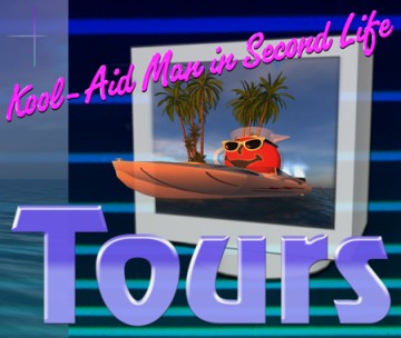 I caught Rafman’s presentation of a live virtual tour of Second Life as it was delivered to an audience at Montreal performance venue, Il Motore. The presentation, which has happened in numerous cities now (and received much press), entails Rafman’s live navigation of Second Life with his avatar, Kool-Aid Man, as in The Kool-Aid Man — that exaggeratedly large jug of toxic-colored “drink” whose weird deep-voiced proclamations of oh yeah! and penchant for jumping through brick walls you may remember from marking commercial breaks on Saturday morning cartoons in the eighties. According to Rafman, Kool-Aid Man is identified with a specific demographic, one which grew up before the Internet age. Kool-Aid Man also represents an empty signifier from the decade that defined excess: “you can inscribe whatever you want onto Kool-Aid Man.” Much like Second Life itself, the reappropriation of Kool-Aid Man here, is both a source of ironic humor and a place for self-conscious critique: what is he and what does he represent, if anything?
