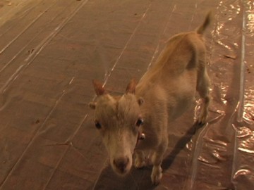Filmed in one of the old textile mills that dominate the central Maine city of Lewiston, where the artist teaches in Bates College’s Department of Theater and Rhetoric, Small Cup is a layered commentary on architectural symbols of power. Set in the center of the cavernous mill is a small-scale Italianate cupola (a “small cup”) that is gradually overtaken by a group of curious goats and chickens, who feed, lay and crush eggs, and defecate inside it, butting and scratching until the dome falls. Score one for the animal house – carnivalesque, disturbing and triumphant.