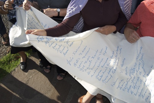 For instance, for This the People Will Never Forget at the Serralves Foundation in Oporto, Portugal, I worked with a group of embroiders from a small community in Madeira Island who have long been in resistance to the dominant political establishment of the island. Over time, their traditional craft has lost economic viability, and their once shared afternoons embroidering have become more solitary. For this project, within a fairly tight time-frame, they had to embroider eight hundred-plus signatures onto pieces of raw linen. The signatures were from a petition submitted by members of their community, and included their own. When I asked about compensation, they refused to accept pay, and it quickly became clear the project would be conducted on their terms. Their commitment to the timeline we had established became one more demonstration of their collective resolve and capacity to face and surpass obstacles. The work became both a celebration and a demonstration of their determination. At our final meeting, one of the bordadeiras (embroiders) held me by the arm, brought me in closer to her, and whispered: “they want war…we give them war!” In contrast to the violent political regime that they would oppose, theirs is a war of gorgeous blue thread on raw linen expressing their refusal to surrender their parish and priest to the corrupt hierarchy of the island’s church establishment.