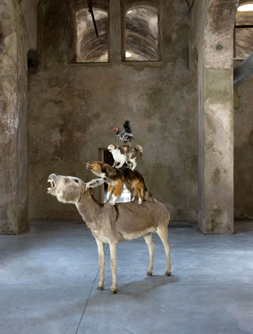 Ironically, Pyramid of Animals had its uncanny doppelganger in the work of Maurizio Cattelan, Love Saves Life (1995), perhaps proving that in addition to Arthur Danto’s “Historical Museum of Monochrome Art,” we could also construct a museum of shockingly-similar anti-modernist sculpture. Both pieces consist of four taxidermic animals standing on top of each other, loosely reflecting the protagonists of a fairytale by the Brothers Grimm, The Bremen Town Musicians: a rooster, a cat, a dog, and a donkey – more faithful to the Cattelan story would have been a horse – in the case of Kozyra (one of the main criteria for the sculpture was to obtain red-haired animals in order to match the color of the artist’s own hair). Yet, while Cattelan’s piece at best caused some minor discomfort and anxiety – viewers not being sure whether they are dealing with a tricky joke or something truly morbid (you can read about this in Cattelan’s interview with Nancy Spector in the book: Maurizio Cattelan, London: Phaidon, 2000, p. 23–30), after the public presentation of Kozyra’s piece at the Centre for Contemporary Art in Warsaw, all hell broke loose.