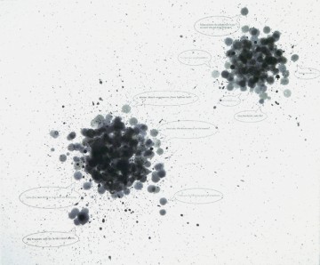 His first set of prints, which were created at Crown Point Press in 2004, explore “the idea of the spot…and images of black that have many meanings” (from a video of the artist speaking about the work on the Crown Point Press website). Because he had abandoned studio practice, Wilson was initially unsure of how he would proceed, but he quickly found an elegant means to express his concept. Using the traditional medium of spit-bite, he dripped acid on the plate and allowed it to etch for varying lengths of time, thus achieving a wide range of black tones. He then animated the spots with “black voices by white writers…Taken out of the context of their original books, they are able to have a conversation with each other about a subject that I, as an African American, want them to talk about” (Crown Point Press video – images and texts are available on their website).