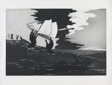 Kara Walker’s recent suite of six etchings, An Unpeopled Land in Uncharted Waters (2010) can also be read as a meditation on the horrors and aftermath of the Middle Passage. The first and signature image, no world (which was also published as a single sheet, illustrated) dramatizes the initial trade and ocean voyage that would have initiated an African woman’s life as a slave. The following five works suggest the panoply of sorrows that have followed. As described by Hilton Als in his October 8, 2007 profile of Walker in the New Yorker, “In Walker’s work, slavery is a nightmare from which no American has yet awakened: bondage, ownership, the selling of bodies for power and cash have made twisted figures of blacks and whites alike, leaving us all scarred, hateful, hated, and diminished.”