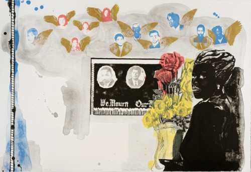 A 1996 print by Marshall, titled Mementos (illustrated top) is the most straightforward among the prints discussed in its homage to Black history and is perhaps therefore an apt one on which to conclude this selected exploration. The print is closely related to the Souvenir paintings that were shown in Marshall’s multi-media installation of the same title at The Renaissance Society at The University of Chicago in 1998. The images acknowledge the loss of Civil Rights and Black Power Movement figures, including Dr. Martin Luther King, Jr., John F. Kennedy, Malcolm X, Medgar Evers, the four girls that were killed in the Birmingham church bombing, slain Freedom Riders, Black Panther leaders, and others. In the center is an example of “We Mourn Our Loss” banners that were collected at the time. The large female figure holding the vase of flowers is, in Marshall’s words “an angel of annunciation, who looks out at us, acknowledging our arrival and inviting us to come in and remember all the people who are represented there.” Marshall’s intent for the Mementos exhibition and the Souvenir paintings was to pay homage to – and keep in the public eye – the struggle for Black equality in the 1960s. As stated by curator Hamza Walker in his essay for the exhibition catalogue, “Mementos is about remembering so as not to forget the past is still not over,” a sentiment that is echoed in the work of all four artists discussed here and one we are wise to consider as we honor African American History over the coming month.