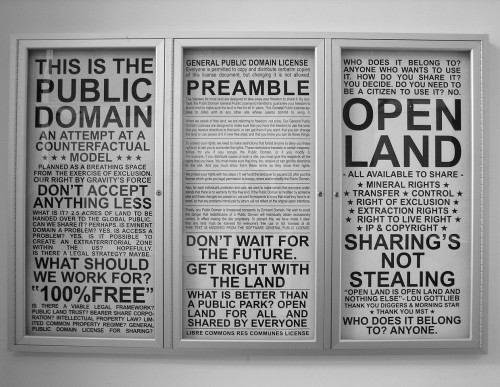 For the past couple years, I have been teaching Bay Area-based artist Amy Balkin’s work within a curriculum about environmental art and “land expropriation.” I teach her work besides Karl Marx’s twenty-seventh chapter of Capital vol. 1, regarding “Expropriation of the Agricultural Population from the land” in 14th– throughout 19th-century Europe. I also teach her work alongside Robert Smithson’s writings on the planning and maintenance of Central Park in New York City, and Agnes Denes’s writings about her Wheatfield (1982) and Tree Mountain (1992-1996) remediation projects. These art writings/projects form obvious parallels with Balkin’s work, which has to do with land use, the creation of public space, as well as the legal, economic, political, and social problematic of positing a “global commons”—an international, public space that would be the property of all and none simultaneously. Which is to say, would be shared in common.