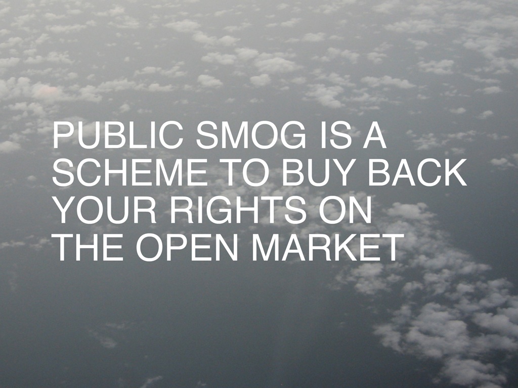Some of my work deals with constructing “speculative counter-spaces” I’d like to see, such as a permanent global commons (in the project This is the Public Domain), or a clean-air park (Public Smog) in real space. I’m sure I’m not alone in wanting more equitable relations globally around access to and control of land, water, and air. But there’s also a range of issues raised by these kinds of projects, including questions of dilettantism when addressing issues of expropriation. It’s easy to think of current examples of brutal struggle over land, including land grabs, occupation, and forced expulsions, so what are the relative stakes?