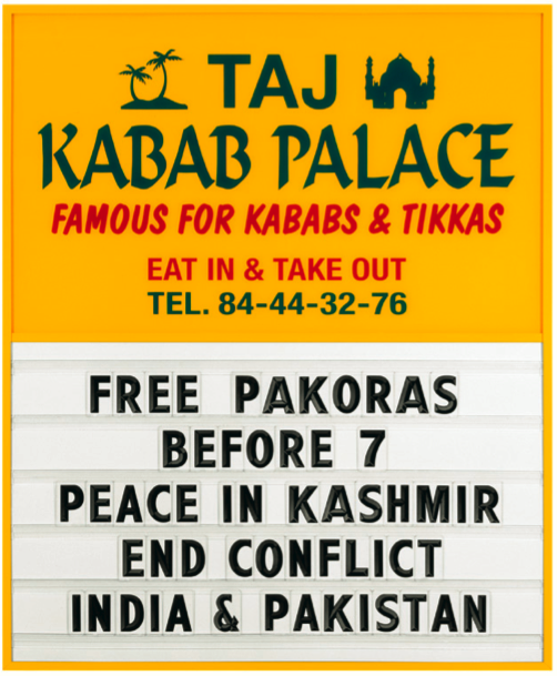 Lum’s Shopkeeper Signs series consists of low-end fictional retail advertising signs imbued with social, political, and personal messages that often (but not exclusively) deal with the complex place of newcomer status in Canadian society. The signs themselves look like legitimate business signs you might see outside a small business while driving through a town. But it is their text that sets them apart. One sign reads: “Taj Kabab Palace Free Pakoras Before 7 Peace in Kashmir End Conflict India & Pakistan.” “McGill & Son Paper and Printing” announces the moving words: ”To my valued customers: My son is no longer my son.”