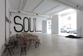 Along with his t-shirt factory, Tiravanija has spray painted the walls with the exhibition title, installed a few sculptures, dug up and left a mound of earth, parked a car, and hung paintings by Spencer Sweeney in the kitchen. But without the soup and what it socially and inwardly engenders, Fear Eats the Soul wouldn’t be half as good.