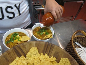 On the Friday afternoon that I visited Tiravanija’s soup kitchen, it had the feeling of a friendly neighborhood eatery; I was surprised to be greeted by other visitors upon entering the space. “Would you like a bowl of soup?” asked Tiravanija’s assistant and quickly I accepted. While I selected condiments for my soup, New York magazine’s senior art critic Jerry Saltz introduced himself, recommended a squeeze of lime, and shared his reasons for passing on cilantro. Three or so spoonfuls later, I realized two things: one, Saltz was right about that delightful zing of lime; and two, in my eagerness to try the artist’s cooking, I had failed to ask if the soup was vegetarian! Not only was it made of chicken broth, but my spoon had yet to encounter Peep-sized chunks of meat in this thick brown abyss–also known as Chicken Tortilla Soup. On one hand, I was saddened that my diet would keep me from having the full “Tiravanija experience.” On the other hand, I knew that the soup was just a catalyst for social interaction. I settled for tortilla chips and art world chatter.