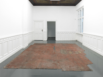 While visiting German artist Jürgen Drescher’s exhibition at Klosterfelde, I thought about this level of abstraction that Smithson talks about – the abstraction that happens when something is transferred to the (unnatural) context of the exhibition space. One of the three works Drescher shows here, Der Boden unter Benn’s Boden (The Floor Beneath Benn’s Floor, 2008/2010), is a large piece of linoleum taken from a pharmacy one floor down from German poet Gottfried Benn’s former apartment. The “once-removedness” of the linoleum floor from Benn’s actual apartment, who lived in Berlin until his death in 1956, makes tangible the abstraction (in terms of a connection to Benn) that this floor represents. While being a “real” object, the linoleum is not the same in the gallery as it was in the pharmacy. At Klosterfelde, it contrasts with the glossy gray concrete floor and resembles an old worn-out piece of leather in its patina. Viewing it here neither confirms its biography nor that of Gottfried Benn. Rather, it opens up an associative space that takes the objet trouvé as a possibility for speculation. Its title highlights the distance to the subject, Gottfried Benn, who never walked on this floor but whose muffled footsteps might have been heard, at times, through the old floorboards above.