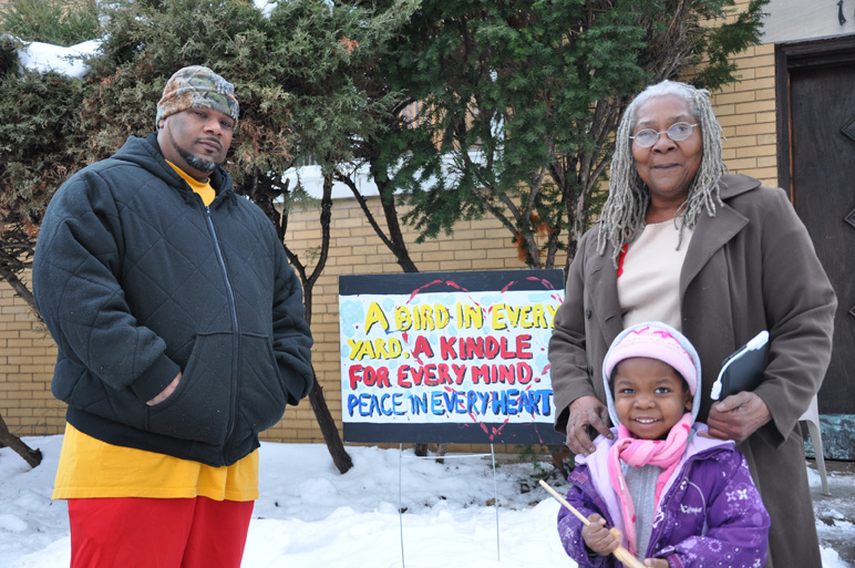 DT: Little anecdotes have trickled in. Some people have watched out their windows as people walk by and look at them and clearly read them, and discuss them. Others look out their windows and see people pay no attention to them. Some people have decided to put them out only on certain occasions. Others have had them stolen or destroyed almost immediately. And some people have left them out through a harsh winter and found them to deteriorate over time. It is a dimension of this project that becomes really personal and intimate — people actually thinking about making a sign for their homes that will represent them to their neighbors, their landlord, their friends.